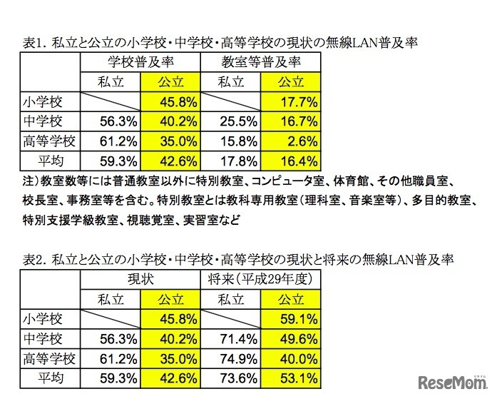 IT・ネット分野専門の市場調査機関であるミック経済研究所は、学校の無線LAN普及率などのアンケート調査結果を発表。無線LANの平均普及率(平成27年5月時点)は、私立学校が59.3%、公立学校が42.6%。