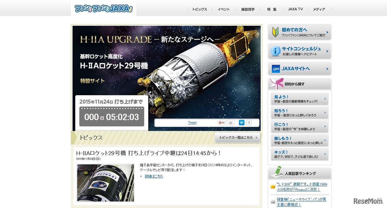 三菱重工業と宇宙航空研究開発機構(JAXA)は11月24日午後3時23分、種子島宇宙センターからH-IIAロケット29号機を打ち上げる。打ち上げのようすは午後2時45分から、インターネットやケーブルテレビ、パブリックビューイング会場などからライブ中継される。