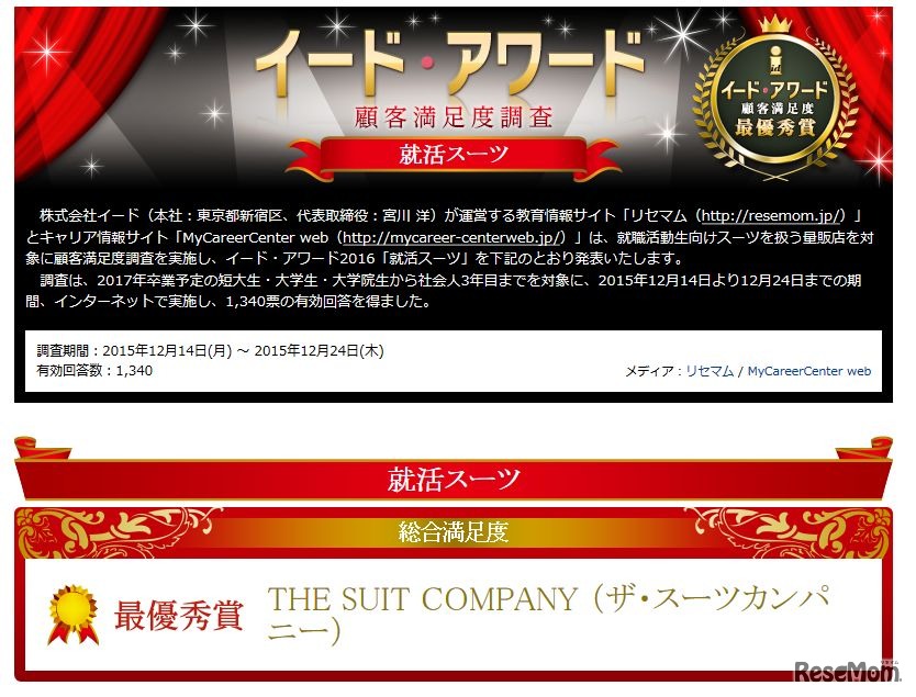 イードが運営するキャリア情報サイト「MyCareerCenter web」と教育情報サイト「リセマム」は1月12日、イード・アワード2016「就活スーツ」を発表した。最優秀賞は、THE SUIT COMPANY(ザ・スーツカンパニー)が受賞した。