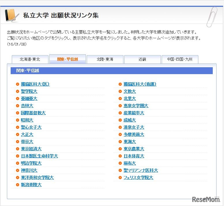 Kei-Netは、私立大学の出願状況を地区ごとに一覧にまとめて公開した。5つの地区に分け、大学にリンクできるようになっている。また、ベネッセ・駿台データネット2016は、国公立、私立大学の出願状況を2月に提供予定。