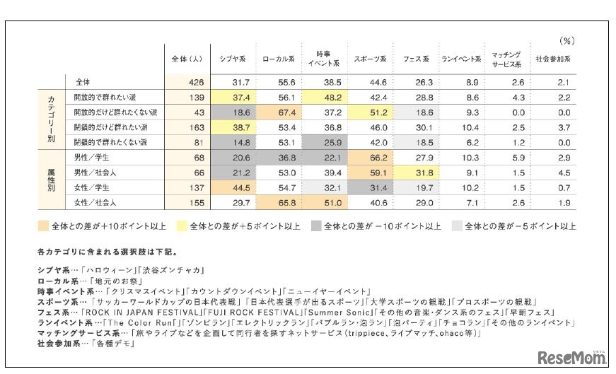 「シブヤ的群衆行動」経験者の分類別参加率