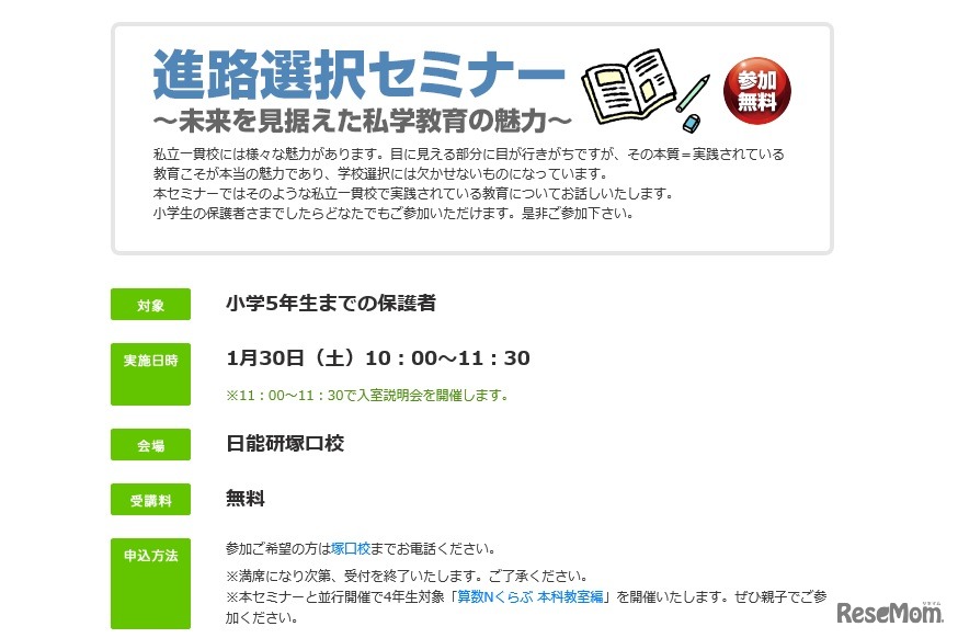 日能研関西は、保護者のための中学受験講座として「進路選択セミナー」を1月30日に開催する。対象となるのは小学5年生までの保護者。受講料は無料だが、事前に電話での申込みが必要。