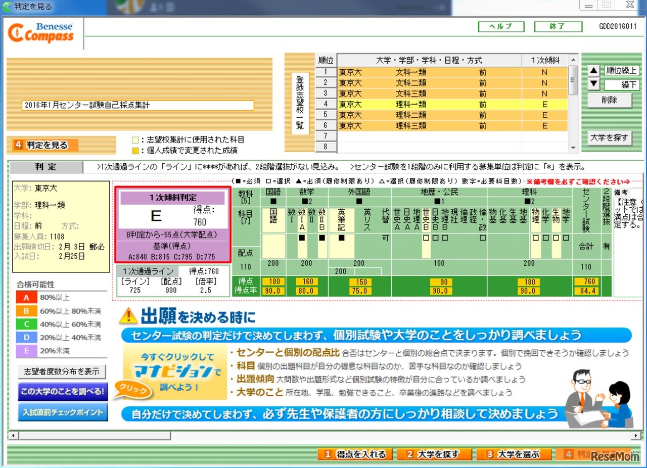 判定結果 得点を入力し東京大学に挑戦