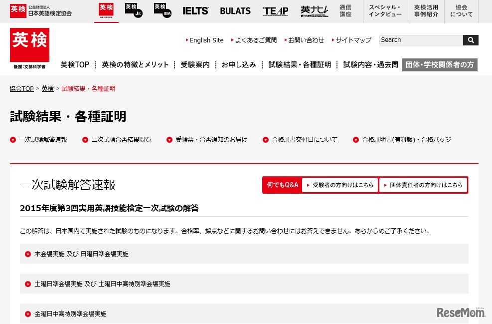 日本英語検定協会は、1月22日から24日に実施した「2015年度第3回実用英語技能検定一次試験」の解答速報をホームページに公開した。解答はPDFで提供されている。