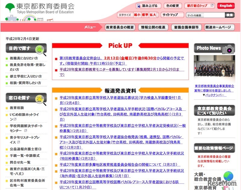 東京都教育委員会は2月4日、平成28年度東京都立高等学校入学者選抜の応募状況(学力検査入学願書受付1日目)を発表。全日制全体の平均倍率は1.49倍、学校別では広尾高校2.70倍、青山高校2.58倍などが高くなっている。願書受付は2月5日(金)正午まで。