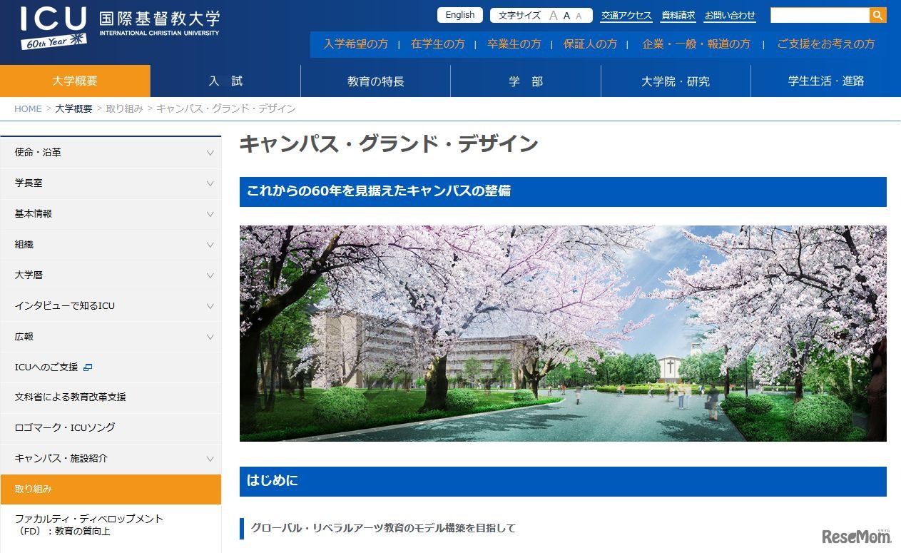 国際基督教大学(ICU)は2月3日、大学Webサイトで新施設の建設および一部施設の建て替え等の基本計画「キャンパス・グランド・デザイン」の概要を公開した。2013年に60周年を迎え、さらに今後ICUはこれからの60年を見据えたキャンパスの整備に取り組む。