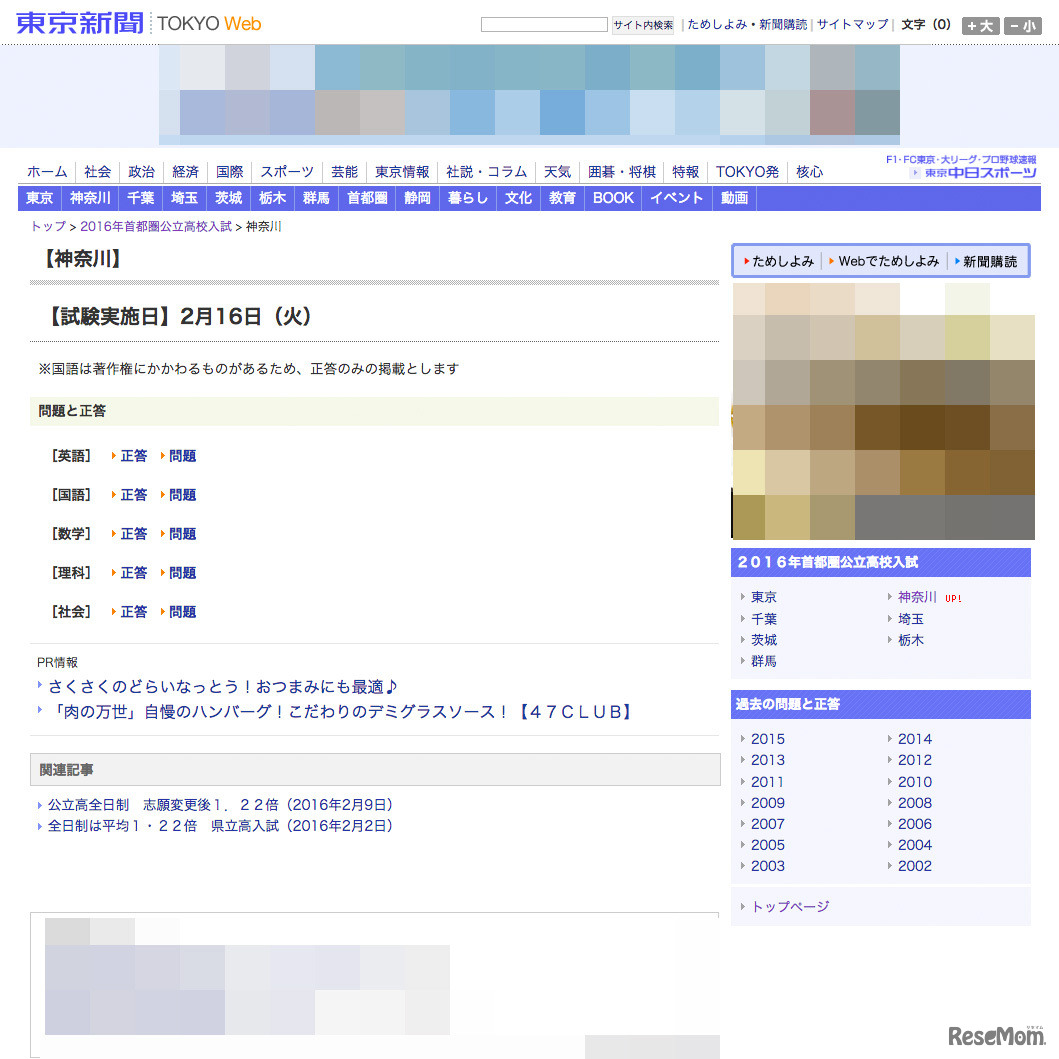 東京新聞は2月16日、特設ページ「2016年首都圏公立高校入試」で、神奈川県公立高校入試問題と正答を公開した。