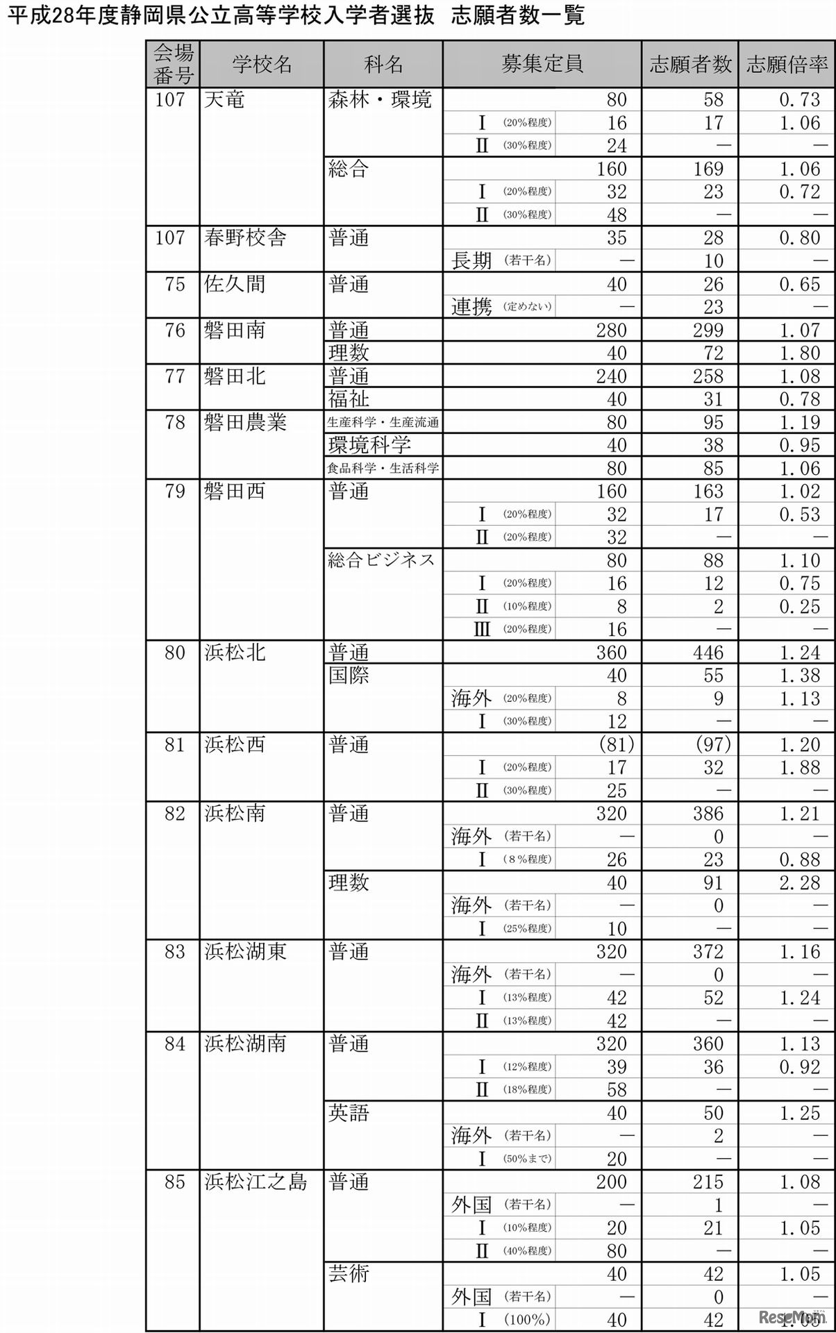 静岡県教育委員会は2月18日、平成28年度公立高等学校入学者選抜の志願状況・倍率を発表した。募集定員合計21,545人に対し、志願者数は23,648人で志願倍率は1.10倍。