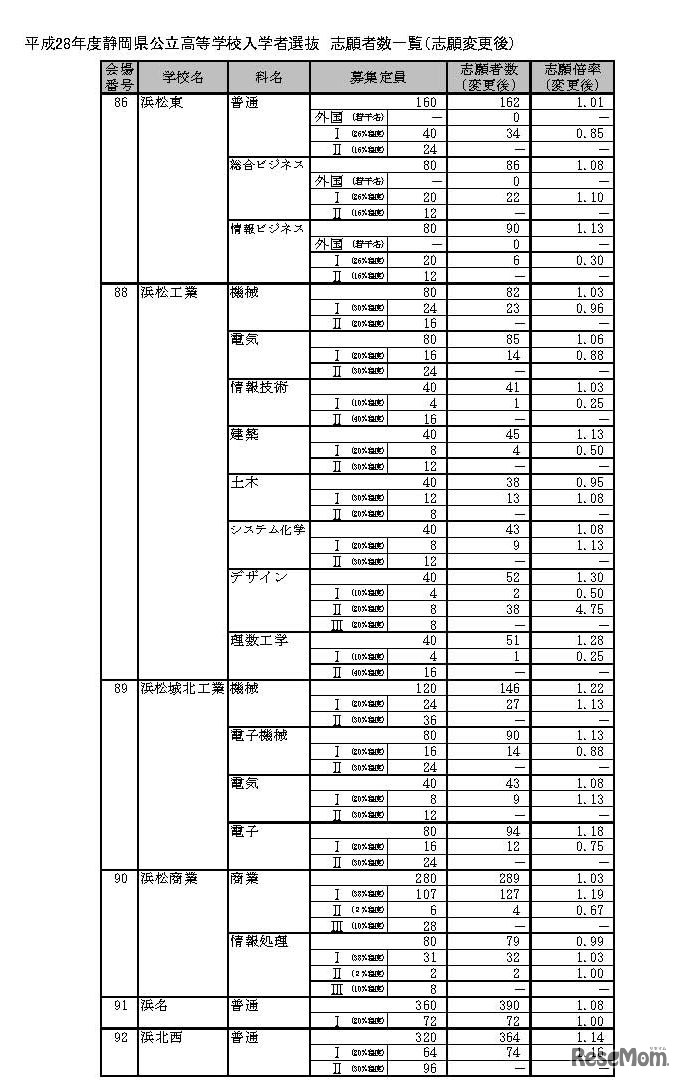 平成28年度静岡県公立高等学校入学者選抜の志願者数・倍率の志願変更後確定状況