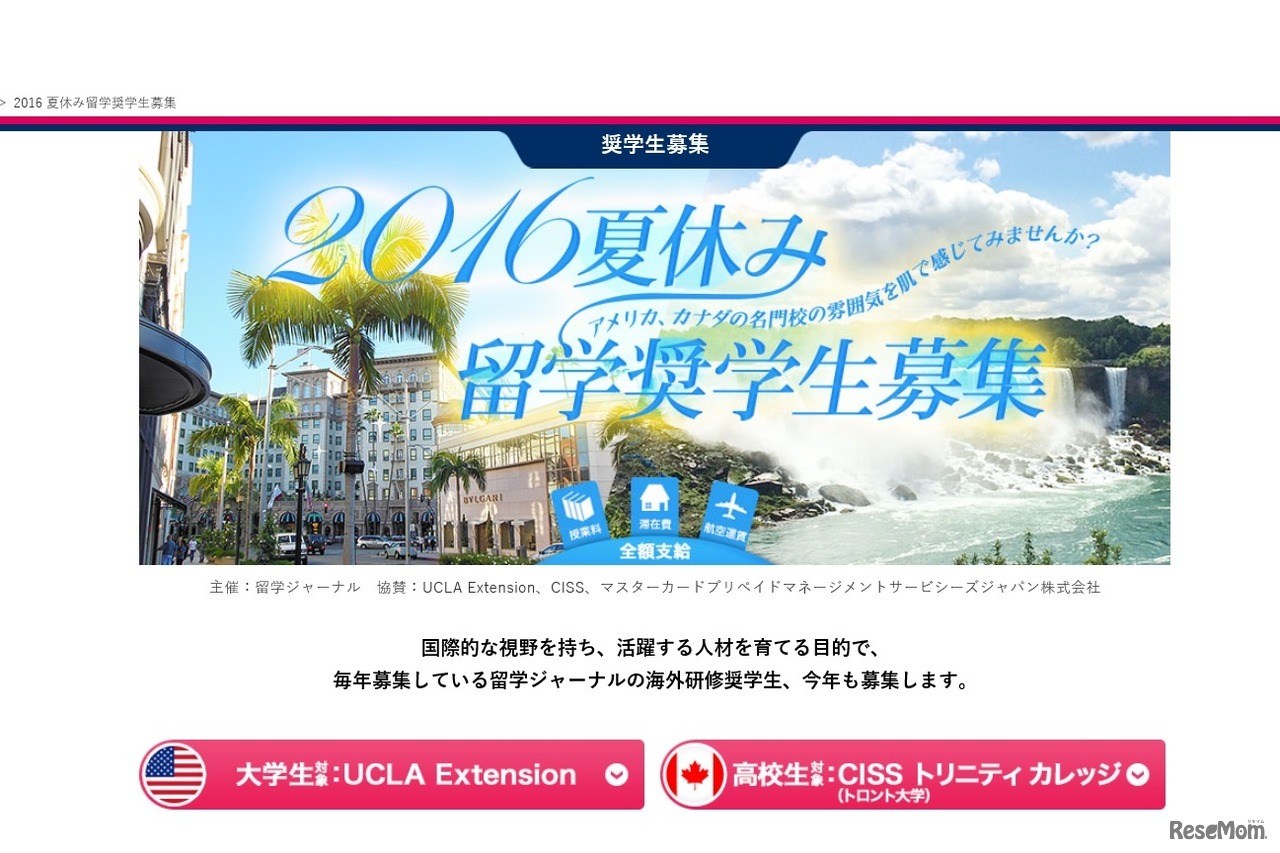 留学ジャーナルは、創業45周年を記念した奨学生第2弾として、アメリカ・カナダの名門校カリフォルニア大学ロサンゼルス校(UCLA)およびトロント大学でひと夏を過ごす「夏休み留学奨学生」の募集を3月1日より開始した。対象はUCLAが大学生でトロント大学が高校生。
