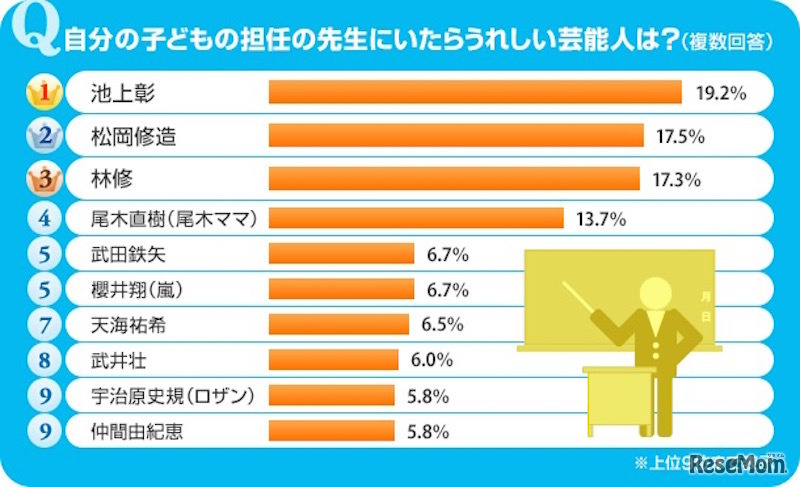 リクルート住まいカンパニーが運営する不動産・住宅サイト「SUUMO(スーモ)」は、新入学・新学期シーズンに「自分の子どもの担任の先生にいたらうれしい芸能人は」というテーマでアンケートを実施した。結果、1位は「池上彰」、2位は「松岡修造」、3位は「林修」だった。