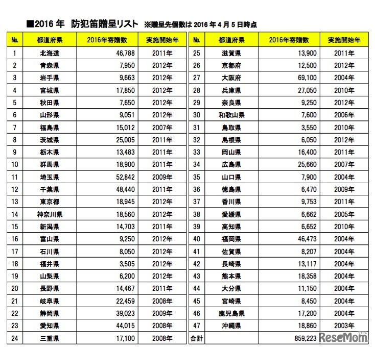 日本マクドナルドは、2003年から新小学1年生を対象にした防犯笛の配布を行っており、2016年は全国47都道府県へ計85万9,223個を贈呈したという。ほかに「子供110番の家」の推進や防犯教室も行っている。