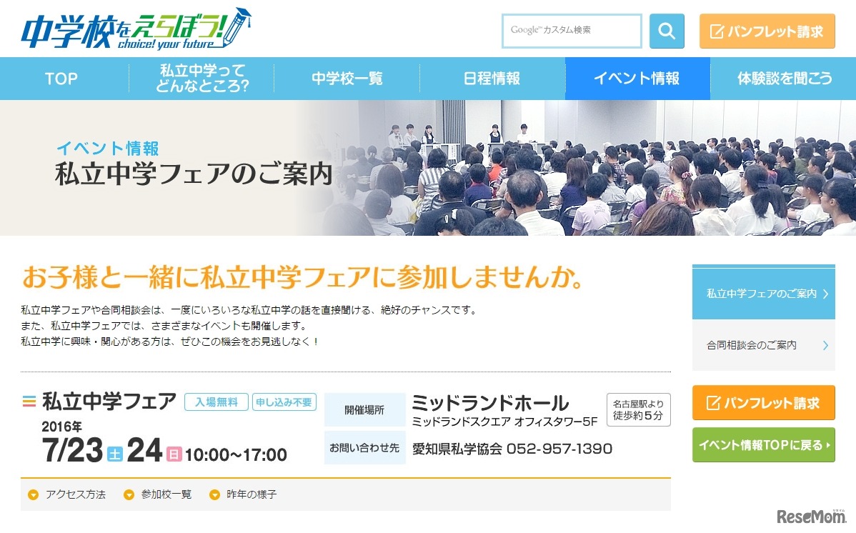 愛知県私学協会中学部会は、「私立中学フェア」を7月23日、24日にミッドランドホールで開催する。フェアは、私立中学25校が参加する県内最大規模のイベント。また、6月には多治見市、一宮市、豊田市の3会場で合同相談会を実施する。入場無料。