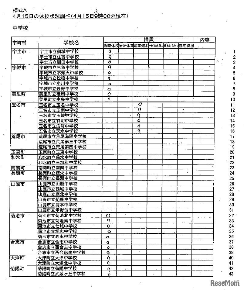 県内市町村立学校(小学校・中学校)の休校等の学校名(4月15日3時現在) 出典:熊本県教育委員会