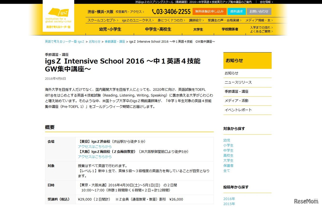 英語で考えるリーダー塾igsZ(アイジーエスゼット)は4月30日と5月1日の2日間、中学1年生を対象とした「英語4技能集中講座」を東京と大阪で開催する。授業はすべて英語で行われ、英語の4技能の基礎力をバランスよく強化するという。