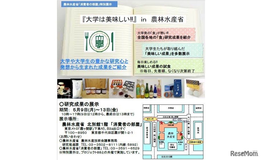 農林水産省は5月9日から13日、「大学は美味しい!!」と題して大学の食品開発研究成果を展示紹介する。災害食の開発をテーマとした特別講演会では、希望者に「防災ランチ」の試食も行われる。