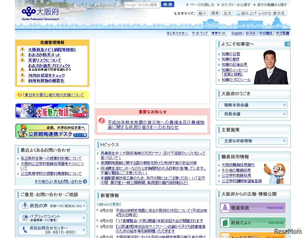 熊本地震の発生を受け、大阪府は被災地域の児童・生徒らの大阪府公立高等学校、大阪府公立支援学校への受入れを開始する。大阪府公立高等学校への転入学に要する入学検定料および入学料は特別免除される。