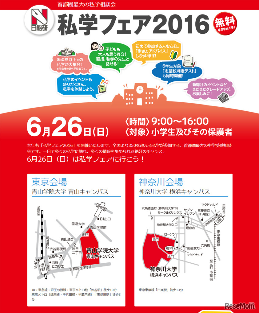 日能研は6月26日、私立中学進学相談会「私学フェア2016」を青山学院大学と神奈川大学の2会場で開催する。中学受験を目指す小学生とその保護者を対象とした進学相談会で、2会場合わせて全国350校以上の私学が参加。入場無料、事前予約不要。