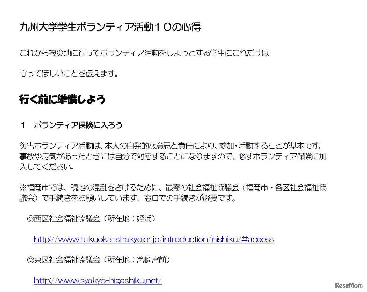 平成28年熊本地震の発生を受け、九州大学は4月26日、被災地でのボランティア活動を考えている学生に向けた「ボランティア活動10の心得」とメッセージを掲載した。早稲田大学や新潟大学、星城大学の対応もまとめて紹介する。