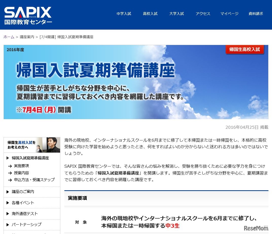 SAPIX国際教育センターは、中学3年生の帰国生を対象とした「2016年度帰国入試夏期準備講座」を7月4日から7月15日までの日程で開講する。科目は数学と国語。オプションで英語も追加可能。申込期間は日本時間の5月9日10時から7月8日18時まで。