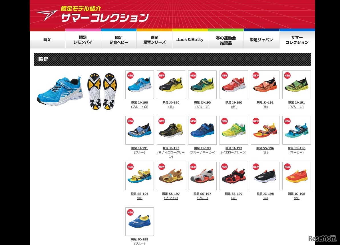 アキレスは、ジュニア用スポーツシューズブランド「瞬足」の2016サマーコレクションを公開した。男子向け「瞬足」は6タイプ19色、女子向け「瞬足レモンパイ」は2タイプ6色。価格は3,000円(税別)から。