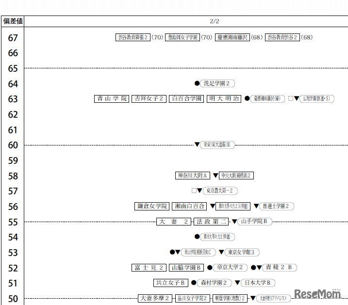 四谷大塚は、4月10日に実施した小学6年生対象「第1回合不合判定テスト」の偏差値一覧を公表した。難関校の合格可能性80%偏差値は、男子が筑波大駒場(72)、開成(71)、女子が桜蔭(72)など。