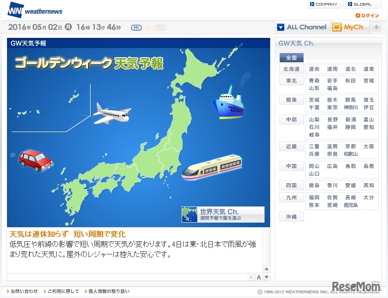 2016年のゴールデンウィークも折り返し。後半に行楽の予定を立てている家族にとって、一番の関心事は天気だろう。全国の人気行楽地周辺を中心に、ウェザーニュースが発表している天気予報を紹介する。