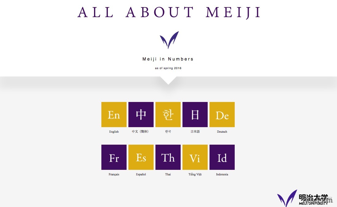 2023年までに年間4,000人の外国人留学生受け入れを目指す明治大学は、日本への留学を検討している海外の学生向けに、大学の特長をわかりやすく伝えるPRサイト「ALL ABOUT MEIJI~Meiji in Numbers~」を公開。日本語を含む10言語で明治大学の魅力を紹介している。
