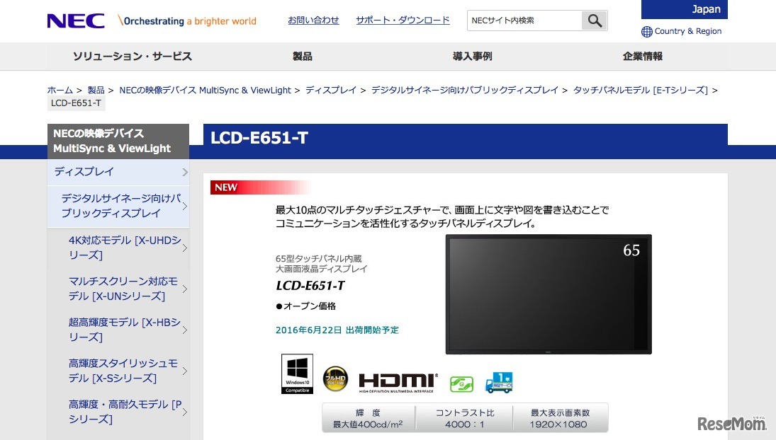 日本電気(NEC)は、画面上に文字や図を直接書き込むことでコミュニケーションを活性化できる、学校や会議での使いやすさに配慮したタッチパネル内蔵ディスプレイ65型電子黒板「液晶ディスプレイ版Brain Boardセットモデル」を6月22日に発売する。
