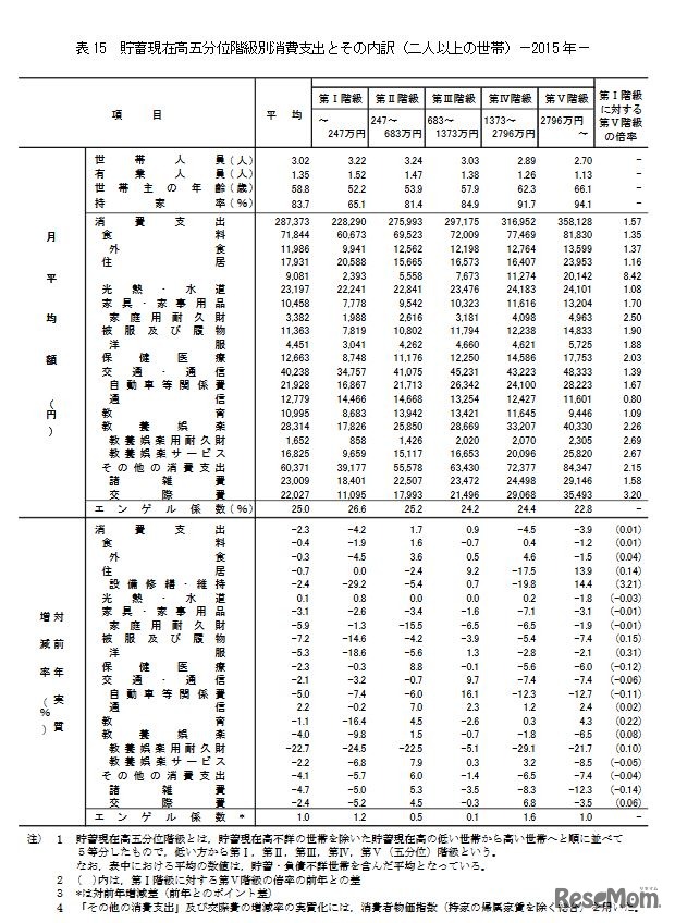 総務省は5月17日、家計調査報告「貯蓄・負債編」の平成27年平均結果速報を公表した。2人以上の世帯の貯蓄額(平均値)は前年比0.4%増の1,805万円、負債額は前年比2.0%減の499万円。教育支出は、貯蓄がもっとも低い階級で前年比16.4%減と、減少が目立った。