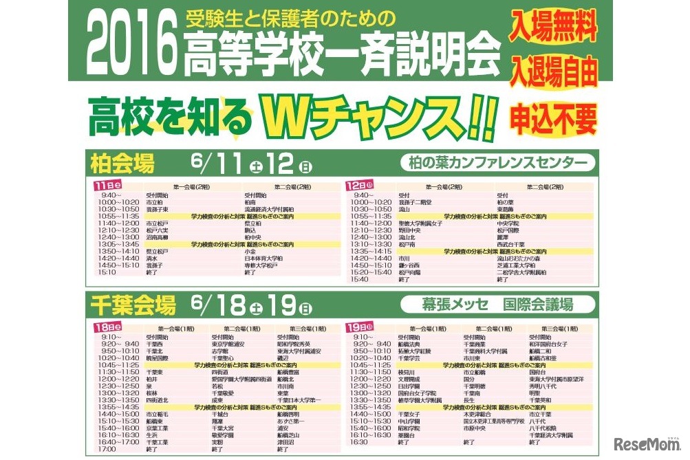 受験生と保護者のための「2016高等学校一斉説明会」が6月、柏・幕張・成田の千葉県内3会場で開催される。私立、県立、市立の各高校入試担当の先生による説明をはじめ、学力検査の分析や対策などを聞くことができる。入場無料。予約不要。入退場自由。