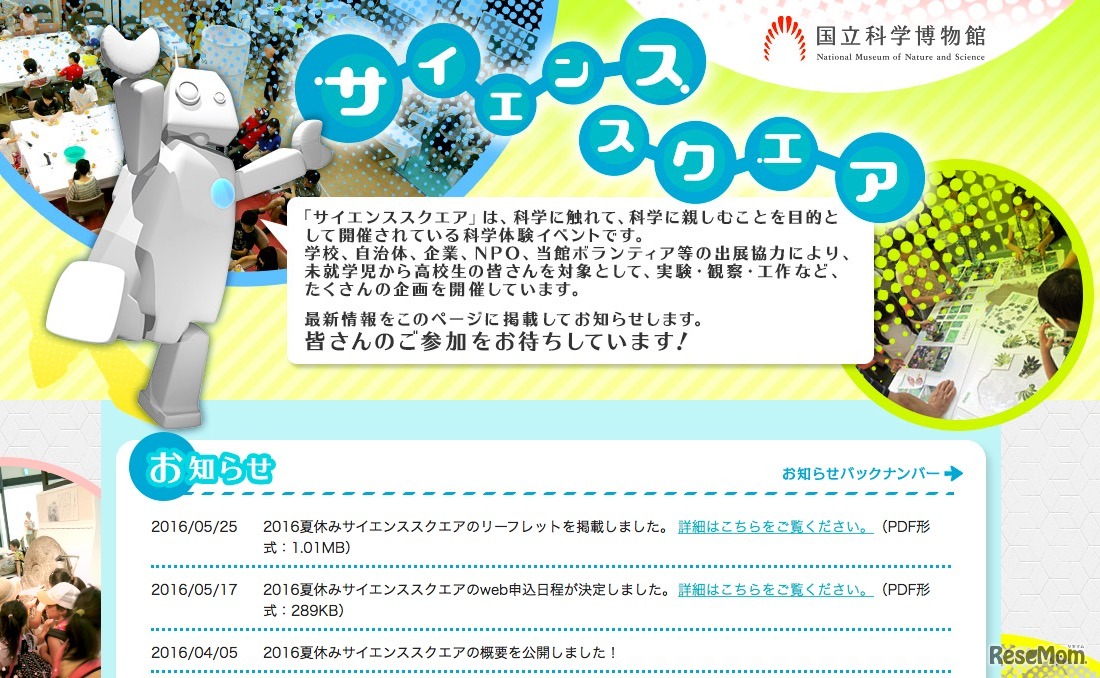 国立科学博物館は7月26日から8月14日の期間、「サイエンススクエア~科学と遊ぶ夏休み!」を開催する。今回は未就学児から高校生を対象に、実験・観察・工作など65プログラムを実施。現在、特設サイトにスケジュールやプログラムを紹介したリーフレットを掲載している。