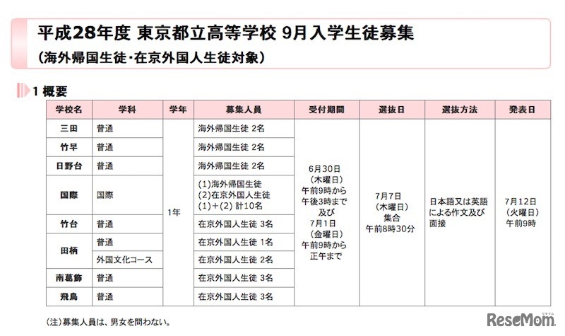 帰国生徒・在京外国人向け都立高校の「9月入学生徒」募集 1枚目の写真・画像