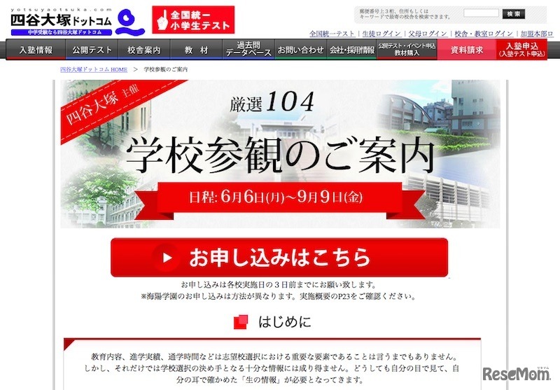 四谷大塚は多くの保護者に向けて、実際の学校の姿に触れ、理解をより深めてもらうことを目的として、四谷大塚主催の「学校参観」を毎年実施している。2016年は6月6日から9月9日まで、聖光学院や豊島岡女子学園など私立中学104校で実施する。