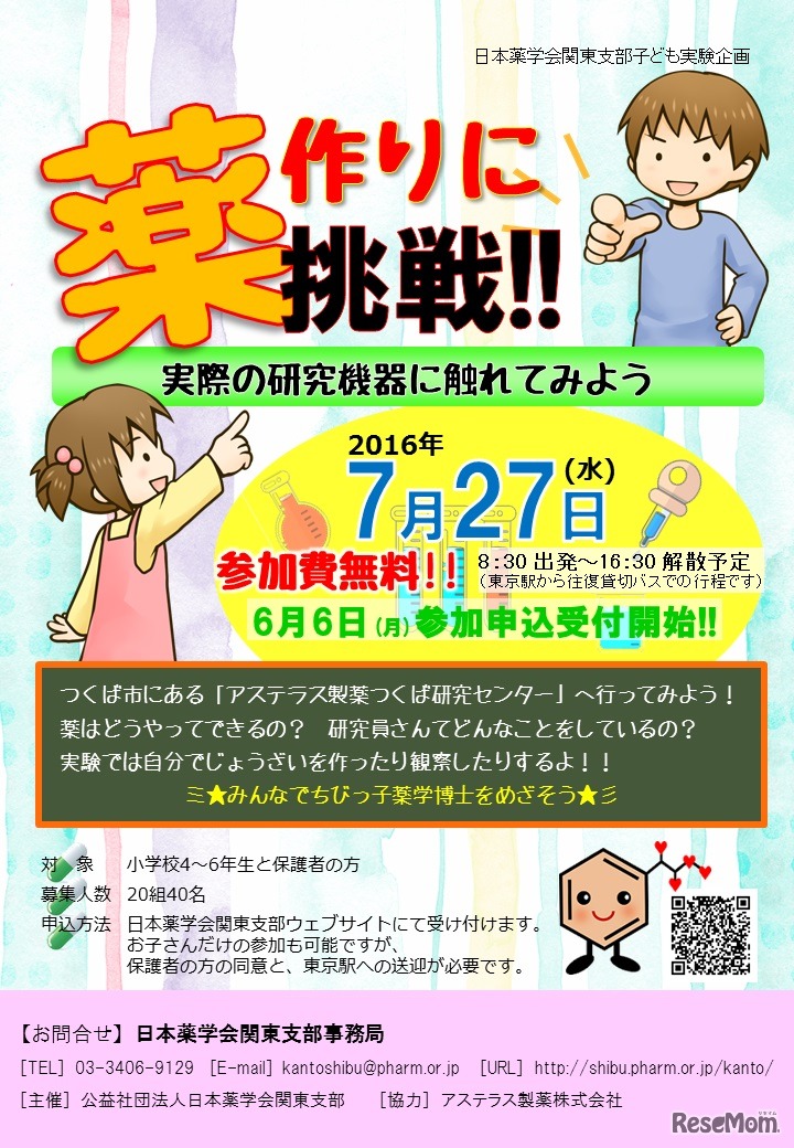 日本薬学会関東支部は7月27日、子ども実験企画を開催する。対象は小学4~6年生とその保護者。参加費は無料だが、集合解散地への交通費は各自負担。申込みは6月6日午前10時より、Webの申込みフォームにて受け付ける。