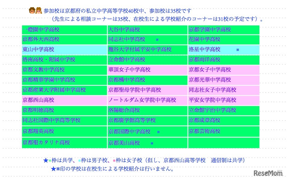 京都府の私立中学高等学校35校が一堂に会する進学相談会「来て見て発見!私学フェアKYOTO」が、6月12日に京都市のみやこめっせにて開催される。個別相談コーナーやイベントステージで、小・中学生や保護者に向け京都の私学学校の特色を紹介する。入場無料。