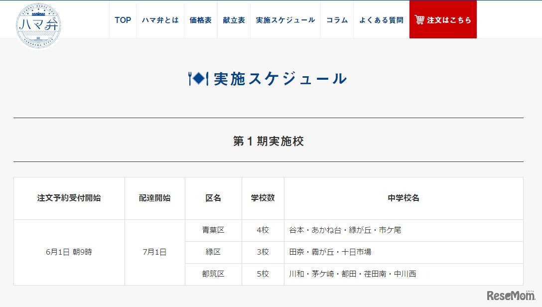 横浜型配達弁当「ハマ弁」の提供が7月1日より横浜市内の12校の中学校でスタートする。これまで横浜市立中学校では家庭弁当を基本としていたが、弁当作りが難しい場合があることから、予約注文できる配達弁当を実施する。