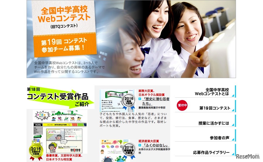 学校インターネット教育推進協会(JAPIAS)が毎年開催する、中・高校生対象の「全国中学高校Webコンテスト」が今年も開催される。中学生の部、高校生の部で参加チームを募集しており、申込期間は7月15日まで。3~5人のチームでオリジナルWebサイトを制作し競い合う。