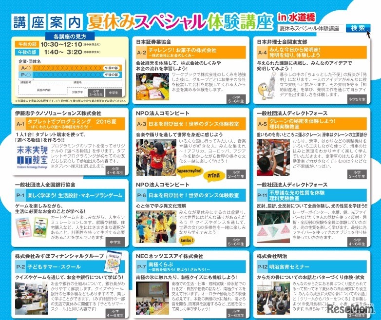 東京都教育委員会は8月6日、都内在住・在学の小学3年生から中学生を対象とした「夏休みスペシャル体験講座」を開催する。企業やNPOなど18団体による「出前授業」体験型プログラムが実施され、参加費は無料。7月8日まで受講申込みを受け付けている。