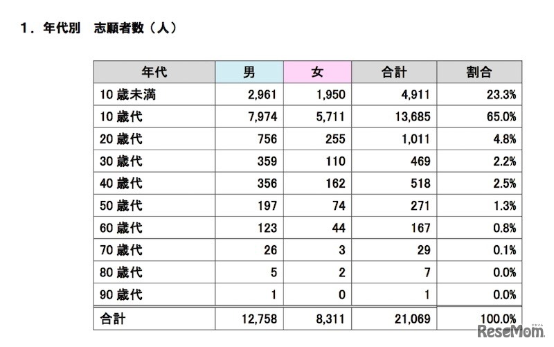 年代別志願者数(日本数学検定協会による集計結果)