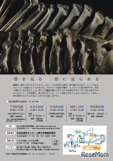 東京大学総合研究博物館は7月8日から11月26日まで、スクール・モバイルミュージアム「骨を見る 骨に見られる」を文京区教育センターで開催する。標本や写真から、動物の骨の美しさや機能などをとらえることができ、会期中には展示監督によるお話会も行われる。