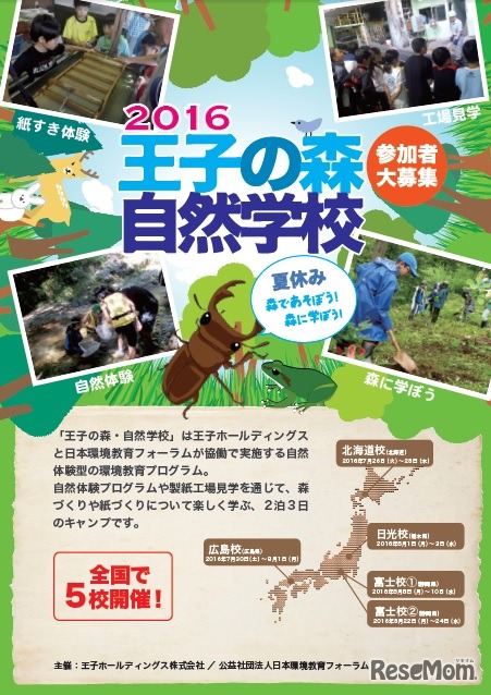 王子ホールディングスと日本環境教育フォーラムは7月下旬~8月下旬、子ども向けの自然体験型環境教育プログラム「王子の森・自然学校」を開催する。対象は小学4年生~中学3年生。北海道、栃木、静岡、広島の4地域で5校が開校され、各校20名を募集している。