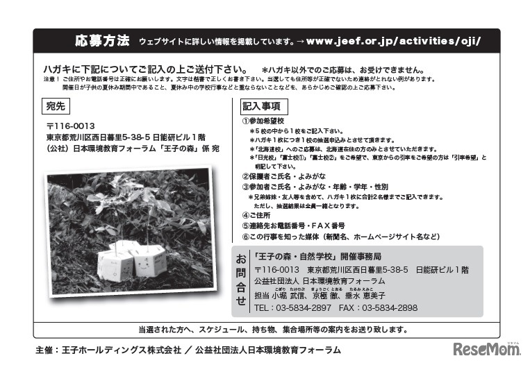 王子ホールディングスと日本環境教育フォーラムは7月下旬~8月下旬、子ども向けの自然体験型環境教育プログラム「王子の森・自然学校」を開催する。対象は小学4年生~中学3年生。北海道、栃木、静岡、広島の4地域で5校が開校され、各校20名を募集している。