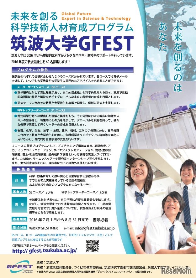 筑波大学は、未来を創る科学技術人材育成プログラム「筑波大学GFEST」にて、2016年度新規受講生を募集する。科学・技術に関する強い興味と関心を持っている中高生が対象。募集期間は、7月1日から8月31日まで。遠方からの受講も可能。