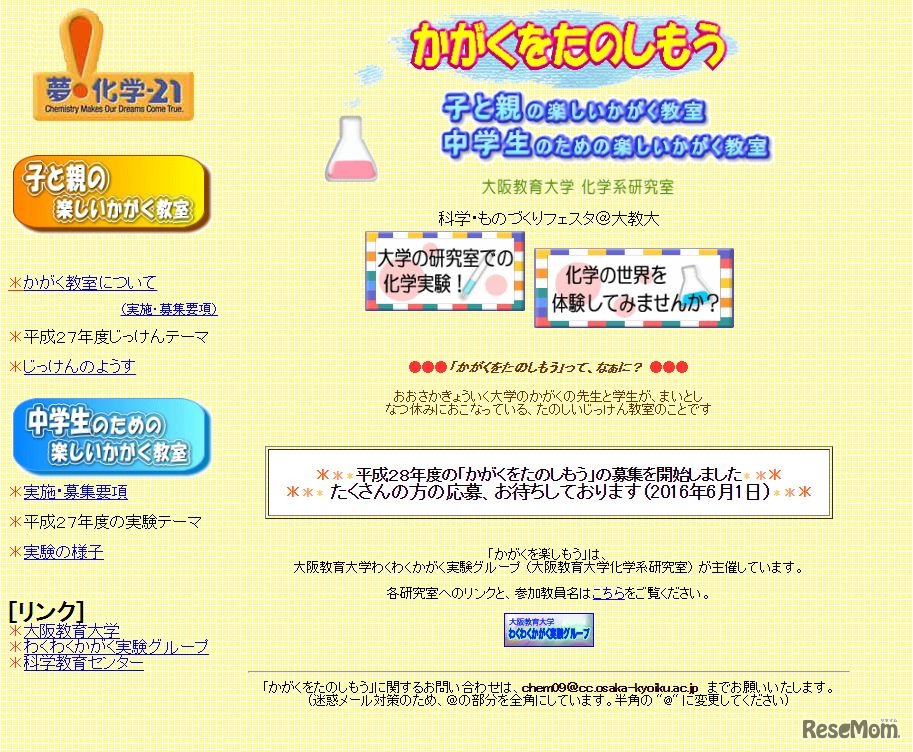 大阪教育大学は、8月20日に小学4~6年生とその保護者を対象とした「子と親の楽しいかがく教室」、8月18日に中学生を対象とした「中学生のための楽しいかがく教室」を開催する。どちらも参加費無料で、事前申込みが必要。