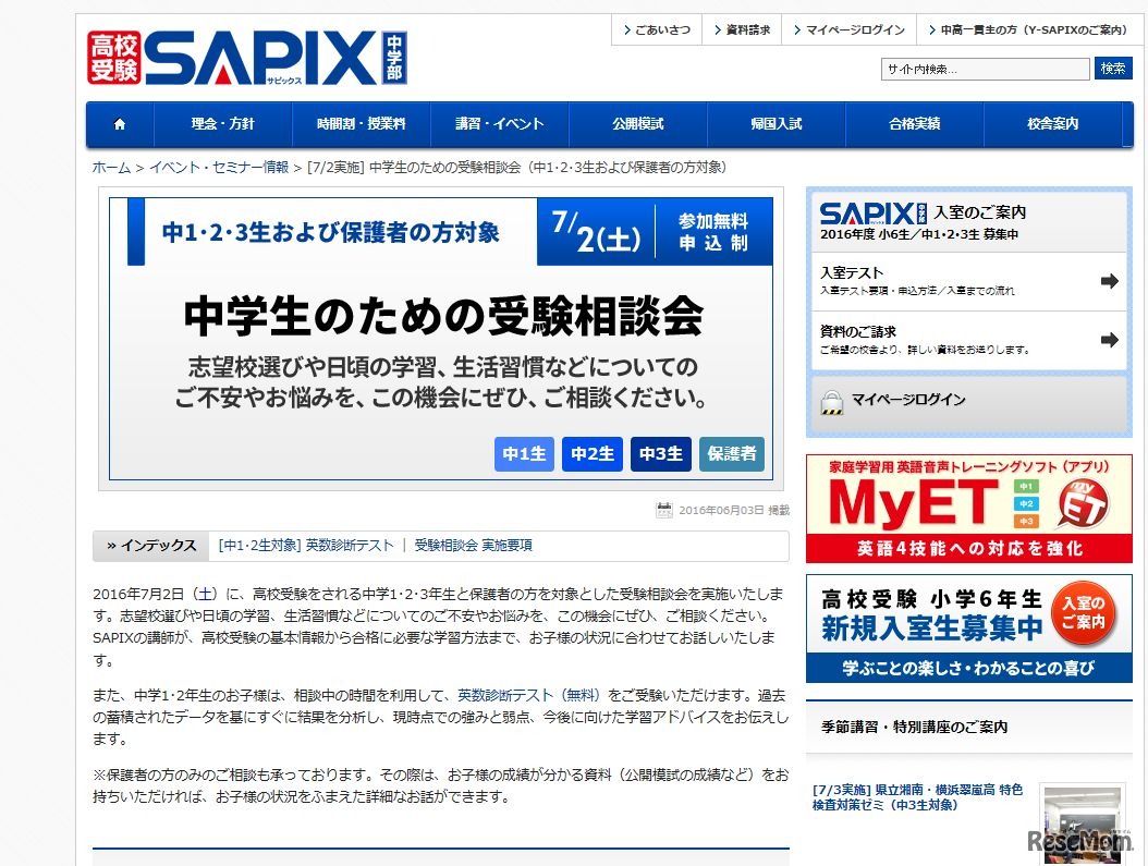 SAPIX中学部は、中学1~3年生と保護者を対象にした「中学生のための受験相談会」を7月2日、各校舎で開催する。中学1、2年生は相談会の時間帯に「英数診断テスト」を受験できる。相談会、診断テストの参加は無料。