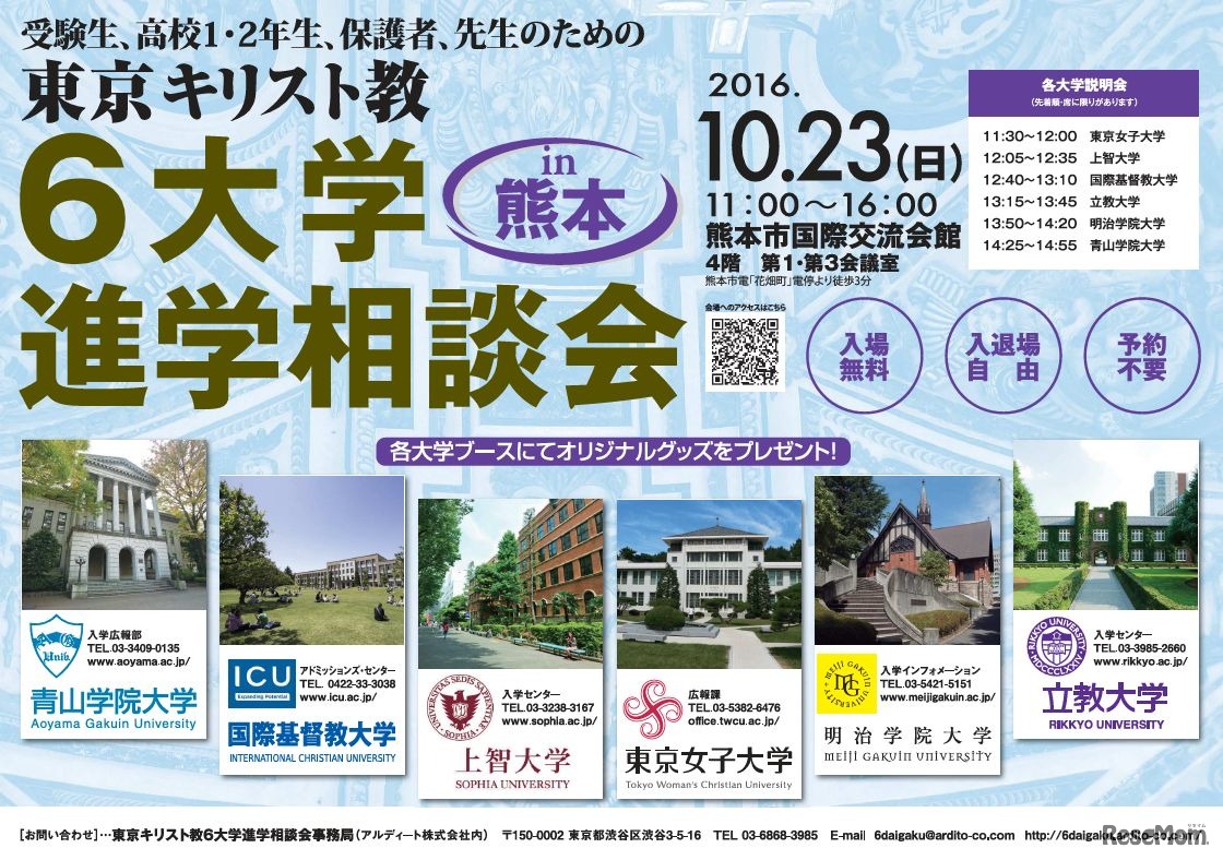 東京キリスト教6大学進学相談会が7月3日に大阪、9月22日に静岡、10月23日に熊本で開催される。青山学院大学と国際基督教大学、上智大学、東京女子大学、明治学院大学、立教大学が参加する。入場無料で事前予約不要、入退場自由。