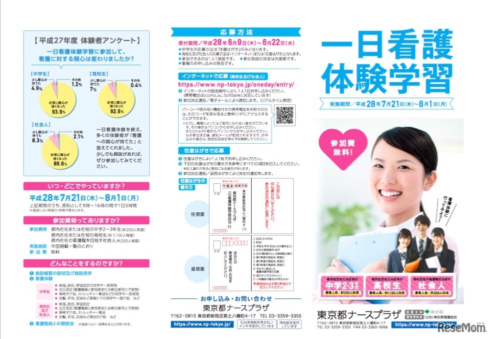 東京都は、看護への理解と関心を深めてもらい進路選択の参考としてもらうべく毎年夏に開催している「一日看護体験学習」を、今年も7月21日~8月1日に開催する。対象は、都内在住または在校の中学2・3年生と高校生および都内在住の看護職を目指す社会人。参加費無料。