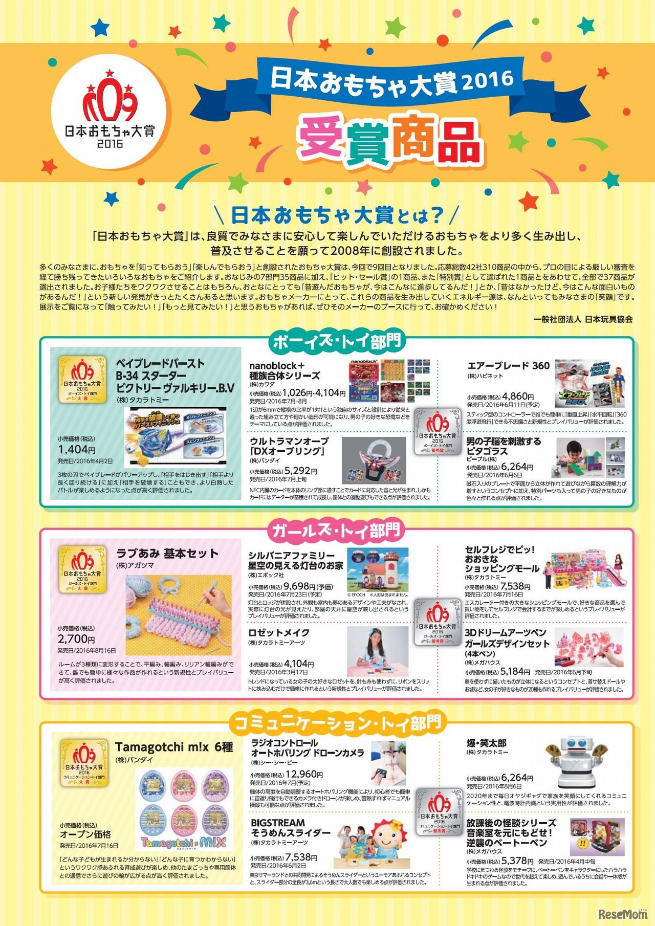 日本玩具協会は6月7日、日本おもちゃ大賞2016を発表した。プロによる厳しい審査を経て、応募総数42社310商品の中から全37商品が受賞した。受賞したおもちゃは、6月11日と12日に東京ビッグサイトで行われる「東京おもちゃショー」で実際に見ることができる。