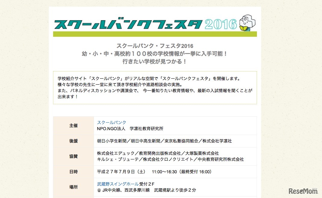 都内の私公立を中心とした首都圏の幼・小・中・高校約100校が一堂に集結する進路相談会「スクールバンクフェスタ2016」が、7月9日に武蔵野スイングホールにて開催される。予約不要で、参加費無料。学校相談会やパネルディスカッションなどで最新の情報が入手できる。